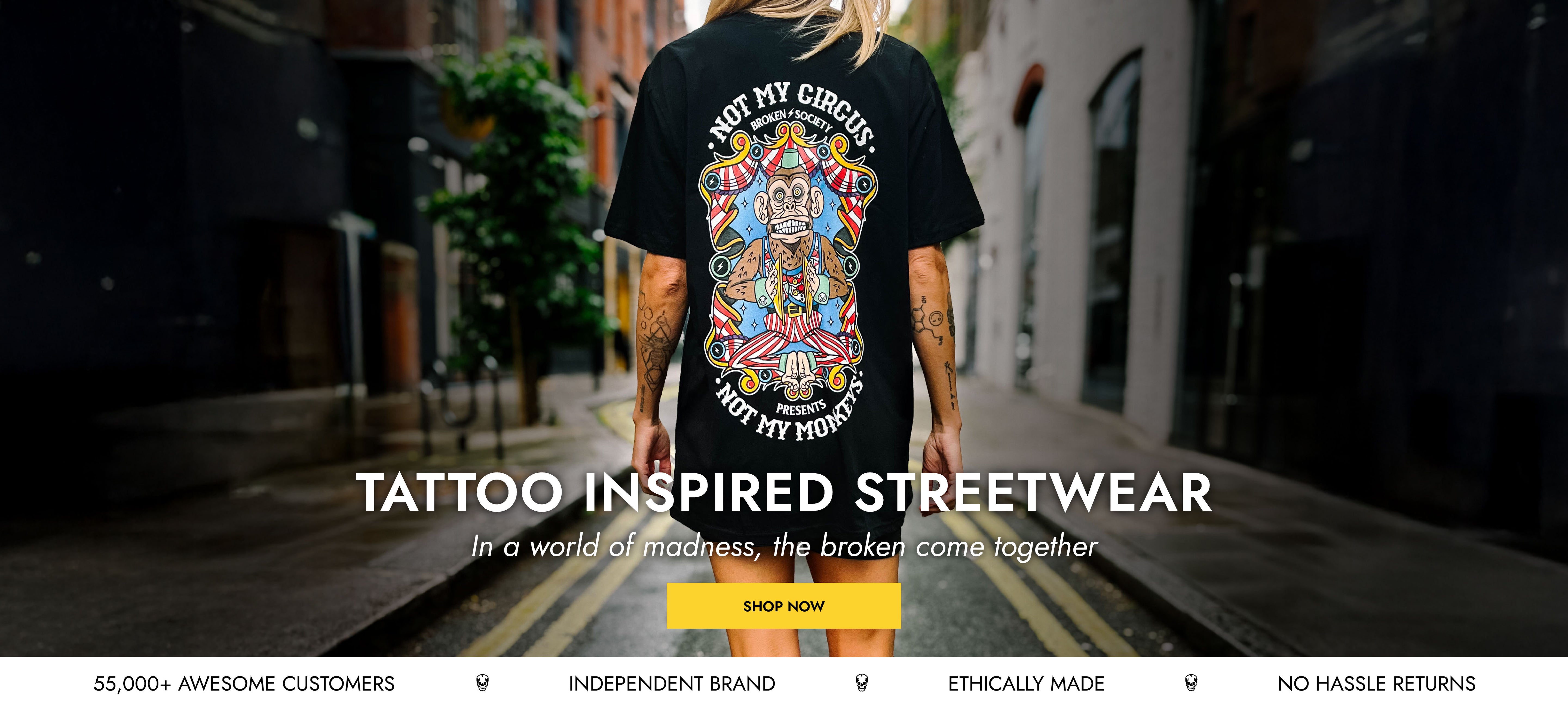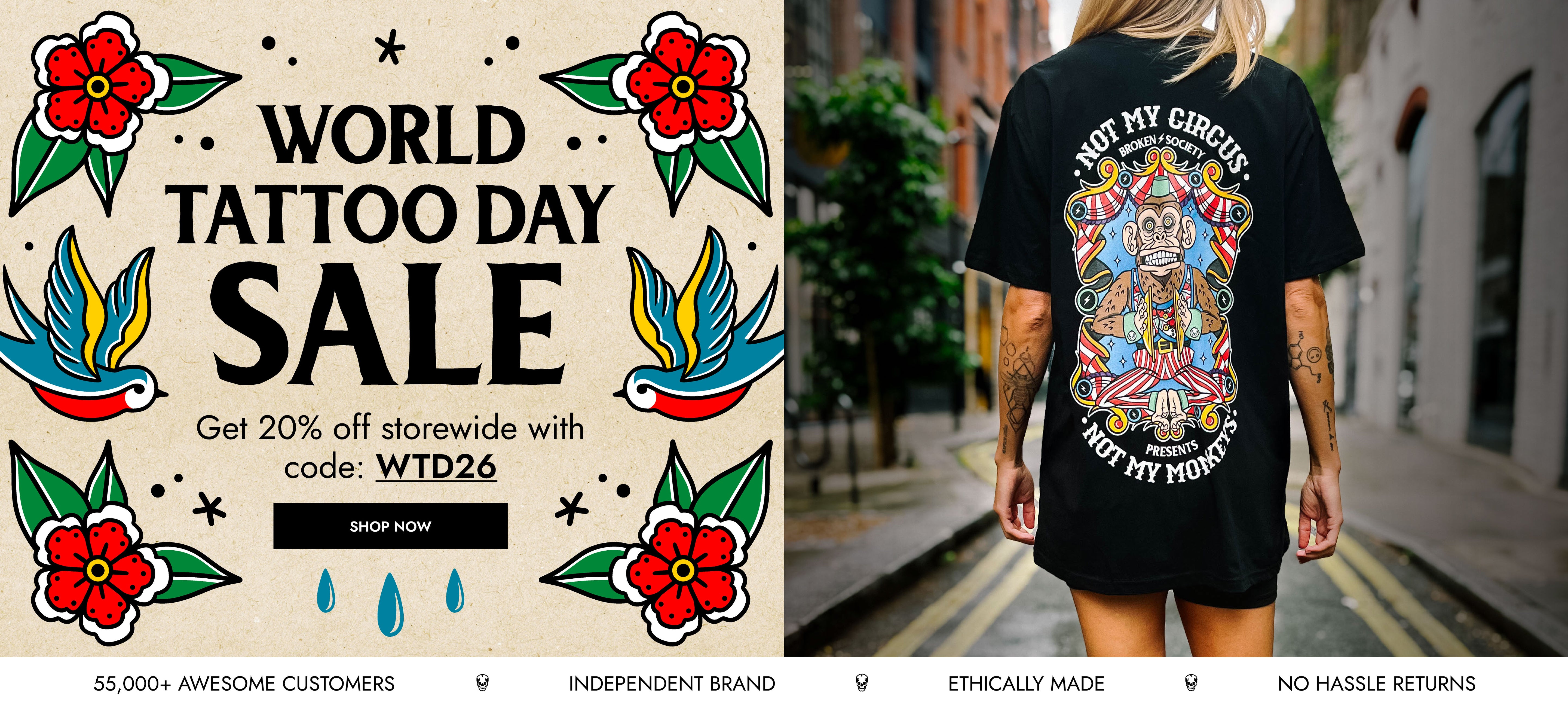 We are Broken Society, an alternative apparel brand specialising in tattoo-inspired clothing and accessories. Our unique artwork is created in-house by our artists, and then printed onto ethically made, premium garments.